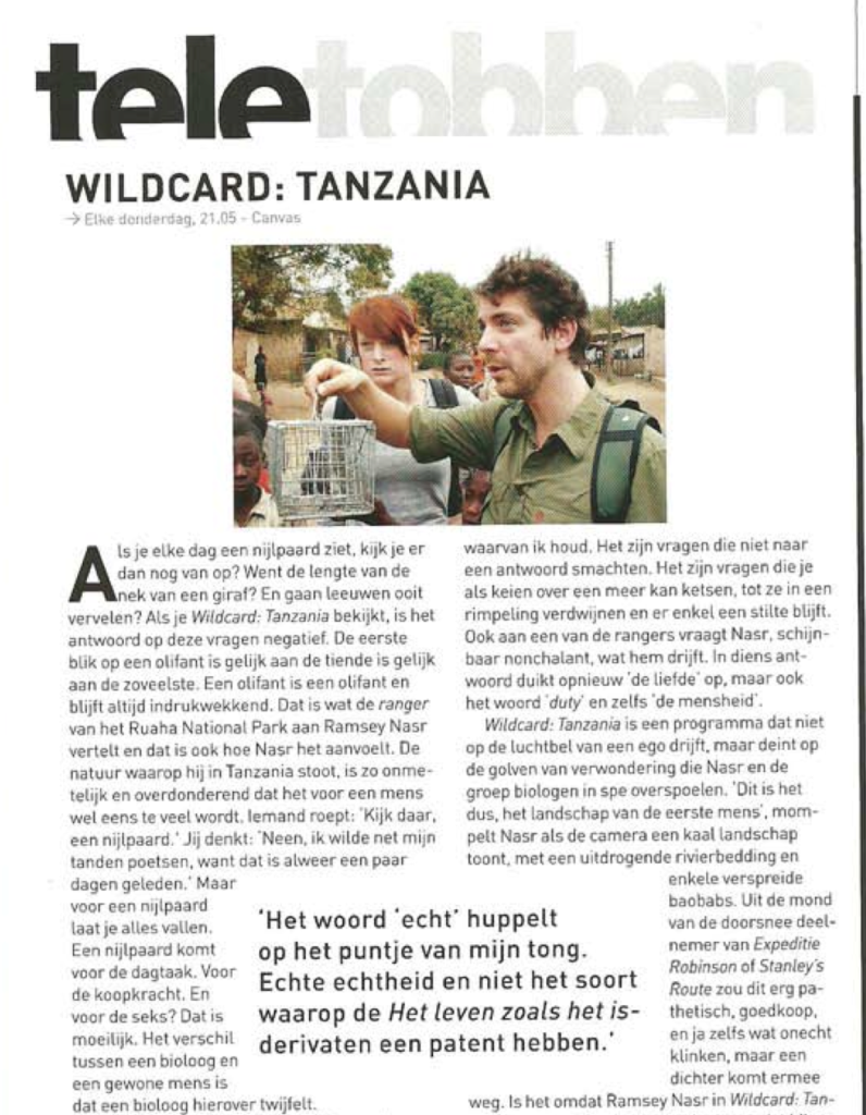 Of zoals Focus Knack het destijds mooi verwoordde in een recensie van mijn documentaire reeks Wildcard Tanzania: ”Het woord ‘echt’ huppelt op het puntje van mijn tong. Echte echtheid en niet het soort waarop ‘het leven zoals het is’ derivaten een patent hebben”